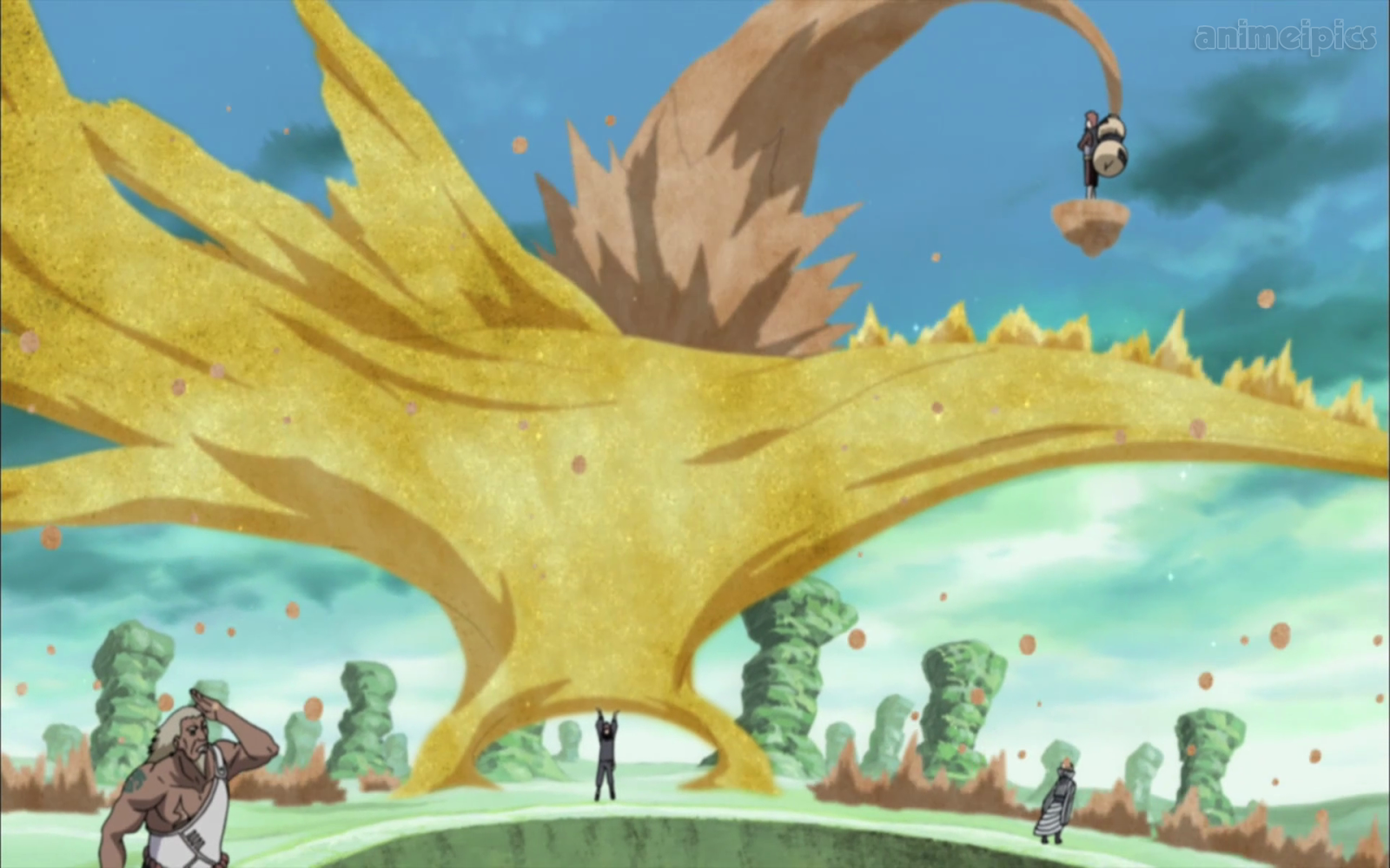 A Yondaime Kazekage a karjait a magasba emeli, majd az aranypor fltte egy falat kpez, hogy vdje t a lgi tmadsoktl.